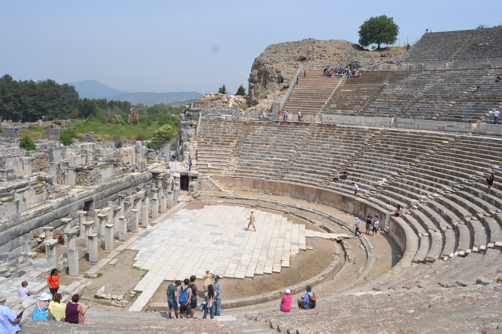 Desde esta ciudad, Éfeso está a un paso. Pueden visitarse las avenidas principales de la antigua ciudad griega y romana y los grandiosos monumentos que quedan en pie o han sido reconstruidos. Las avenidas son largas, de grandes piedras de mármol blanco, y por doquier hay tirados restos de edificios, en mármol y ladrillo, algunas columnas en pie, arcos que ya no abren la puerta a ningún sitio. Una de las avenidas nos lleva al antiguo teatro, en el que se dice que llegaban a caber 26.000 espectadores. Echamos fotos, hablamos desde la escena para comprobar la acústica, tardamos un rato en subir hasta arriba y recorrerlo.