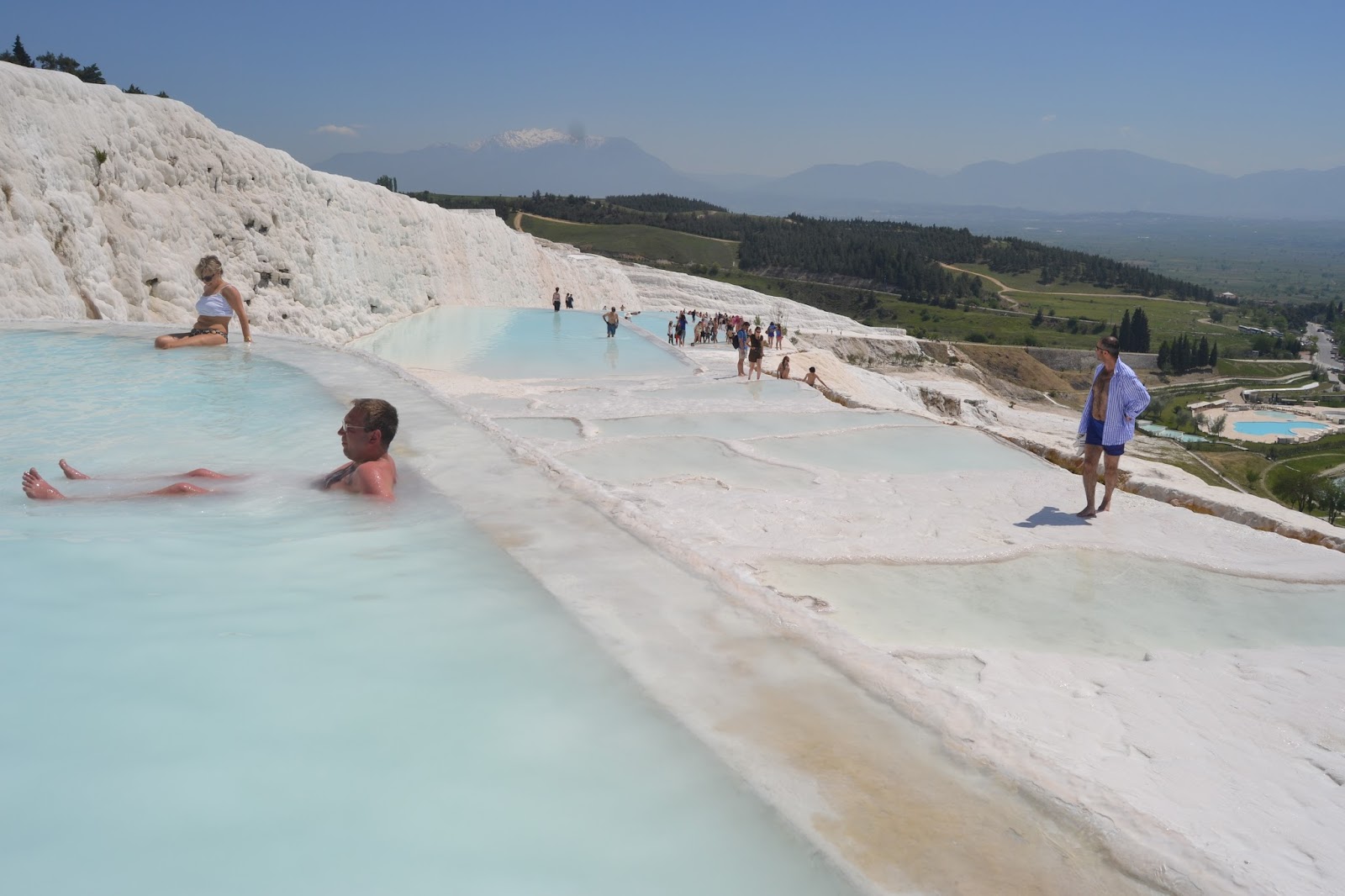 Lo más espectacular, sin embargo, viene a continuación: la ciudad fue construida sobre una colina, y toda la falda de esa colina esta cubierta de blanco. Son anchas paredes de caliza que el agua ha ido moldeando durante siglos, en lo que parecen cascadas detenidas. Se forman pozas de agua, e incluso una parte de la ladera está habilitada para que los turistas bajen descalzos por el curso del agua e incluso se bañen en las piscinas. La bajada está llena de gente que pasea, se baña o se echa fotos, y además es incómodo para los ojos el exceso de luz que proyectan el suelo y las paredes blancas, pero es un espectáculo digno de ver: toda la ladera de la montaña es una catarata blanca, el agua que se estanca en las pozas azules está caliente, la gente nada o posa contra el blanco cegador de la cal, y al fondo un enorme valle verde, y montañas nevadas.
